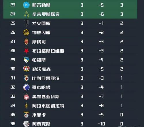 热刺是唯一取得1胜2平积5分的球队,独自排在第15,埃因霍温和亚特兰大则是1胜1平1负积4分位列第16和第17。马赛、马竞、布鲁日、毕尔巴鄂竞技、法兰克福、那不勒斯以及圣吉罗斯联合都是1胜2负积3分,依次排在第18至第24位,尤文图斯、博德闪耀、摩纳哥、布拉格斯拉维亚、帕福斯和勒沃库森则均为2平1负积2分,位列第25至第30。只取得了1平2负的比利亚雷亚尔、哥本哈根、奥林匹亚科斯和阿拉木图凯拉特以1分排在第31至第34,三战皆墨一分未得的本菲卡和阿贾克斯则只能垫底。