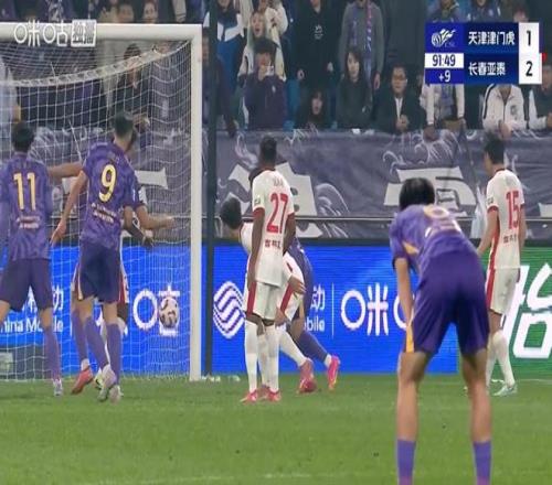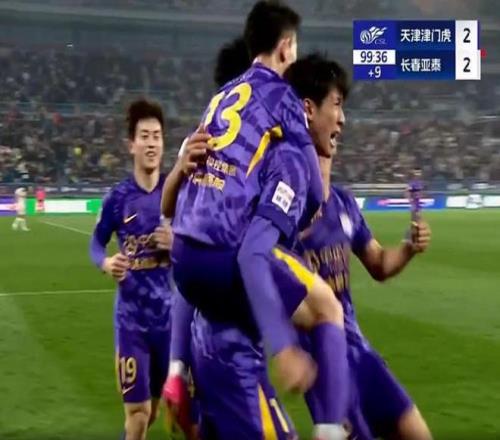补时阶段第90+5分钟,胡安-卡米洛无法坚持,谭龙替补上场。第90+7分钟,王智峰抽筋了。第90+10分钟,津门虎角球进攻,亚泰门前乱战,亚泰球员解围打在横梁下弹出,谢文军推空门得手,打进绝平进球,2-2!